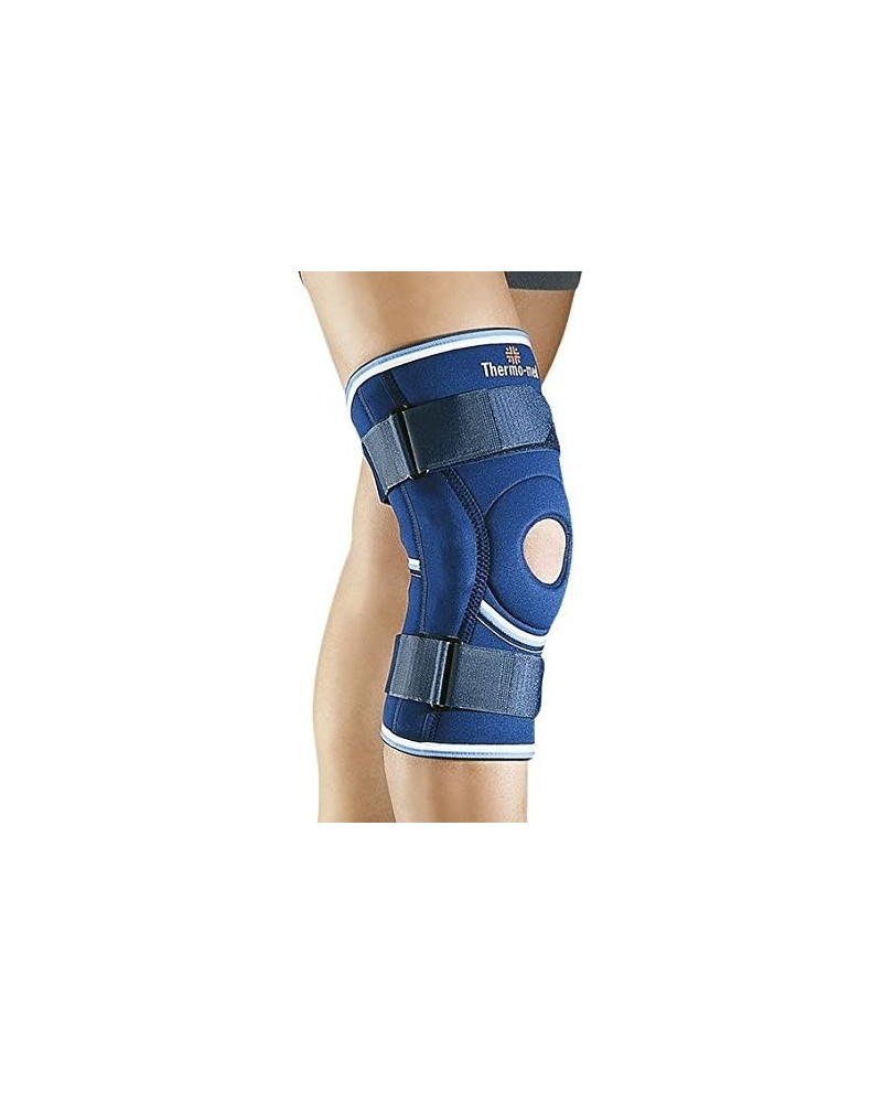 NEOPRENO DE 5 MM CON FLEJES METÁLICOS, ARTICULACIÓN POLI CÉNTRICA Y CINCHAS DE AJUSTE SUPERIOR EN MUSLO E INFERIOR EN PANTORRILLA. ALMOHADILLA PATELAR INTERCAMBIABLE. ABERTURA EN PANTORRILLA. APORTA TERMOCOMPRESIÓN, DESCARGA, ESTABILIDAD Y CENTRADO PERMA.