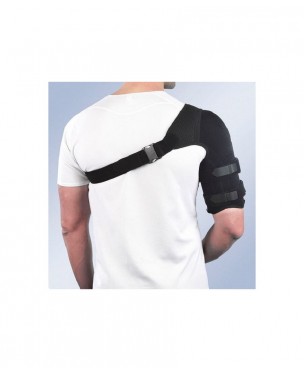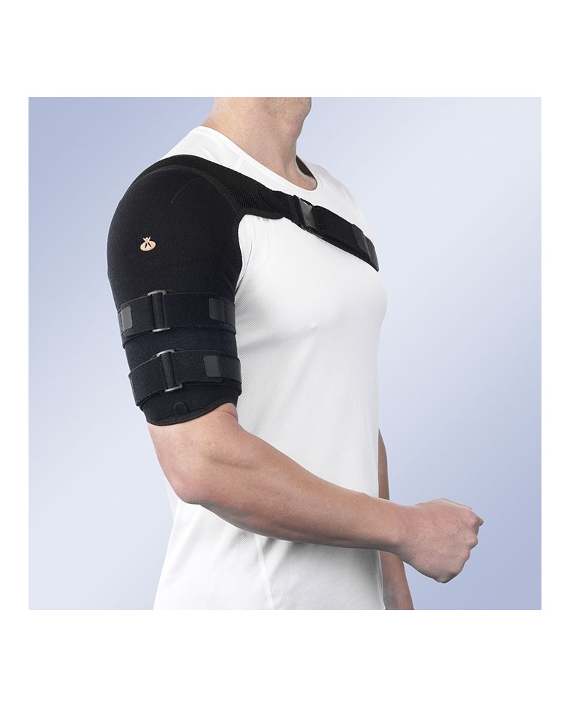 El brace de húmero en termoplástico está forrada interiormente con un tejido de panal transpirable. Se ajusta a través de 2 cinchas humerales en velour y con un cierre de microgancho. La suspensión y la fijación se realiza mediante una cincha pectoral para la desgravación del brazo.