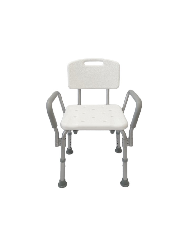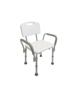 Esta silla de baño con brazos y respaldo es un producto de apoyo para el aseo. Sus reposabrazos acolchados ayudan al agarre e incorporación.
